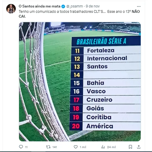 “Os times rebaixados serão Cruzeiro e Goiás por não manterem o mesmo ritmo, por não trazerem uma energia de explosão e de transformação. O Santos tá com a energia muito forte, é o que menos corre perigo”, disse o cartomante Maurício.