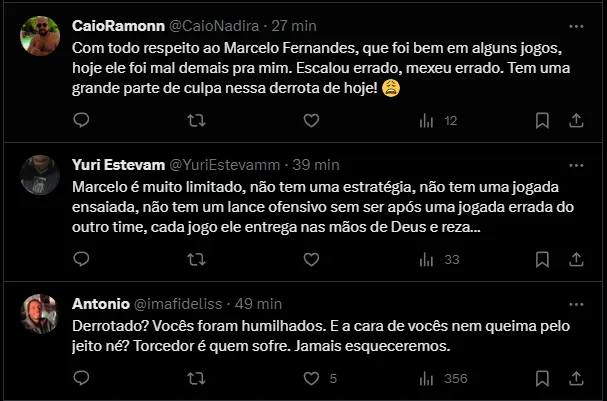 A torcida não aprovou as mudanças e o desempenho apresentado pela equipe durante os 90 minutos. Muitos até pedem a saída de Marcelo Fernandes do comando técnico: