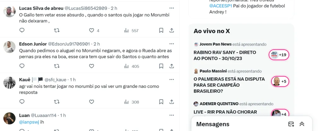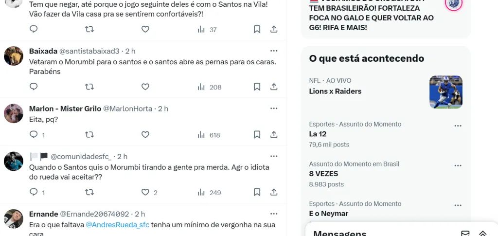 Nas redes sociais, milhares de torcedores do Peixe não gostaram da ideia. Muitos lembraram do ano passado, quando a diretoria tricolor vetou o Morumbi para o Santos jogar uma partida pela Copa Sul-Americana na capital.