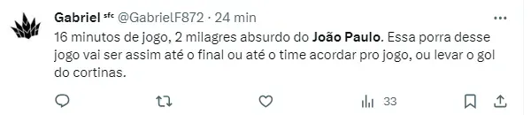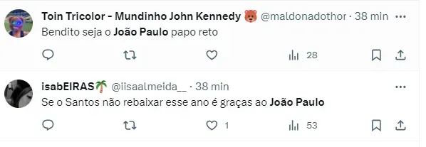 Pelo Twitter, alguns torcedores agradeceram o goleiro: “Se não fosse o João Paulo o Santos já estaria na Série B”, disse uma torcedora. Outro, apelou para as divindades: “Obrigado Deus por João Paulo ser o goleiro do meu time”, completou.