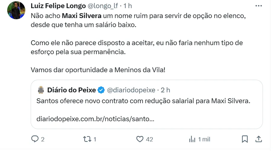 Quem também está de saída é o uruguaio Maxi Silvera. A setorista Laura Marcello, do portal Diário do Peixe, informou que Alexandre Gallo ofereceu um novo contrato ao camisa 17.