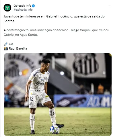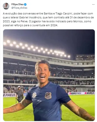 “A evolução das conversas entre Santos e Tiago Carpini, pode fazer com que o lateral Gabriel Inocêncio, que tem contrato até 31 de dezembro de 2023, siga no Peixe”, publicou o colega nas redes sociais.
