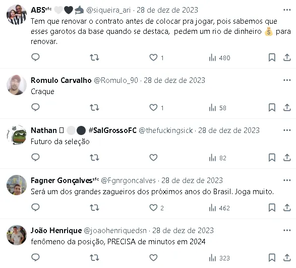 Além disso, a frieza em momentos decisivos e a facilidade nos desarmes em situações de um contra um também têm sido elogiadas por aqueles que acompanham de perto o seu desenvolvimento no CT Rei Pelé.