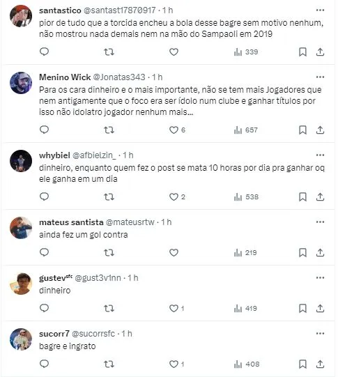 “Jean Lucas falando como se ele estivesse preso no Santos. Preso está o torcedor com o rebaixamento e com a pior das sensações e acreditar que esse cara poderia ser ídolo aqui, é muita palhaçada, falta de respeito!”, bradou outro perfil.
