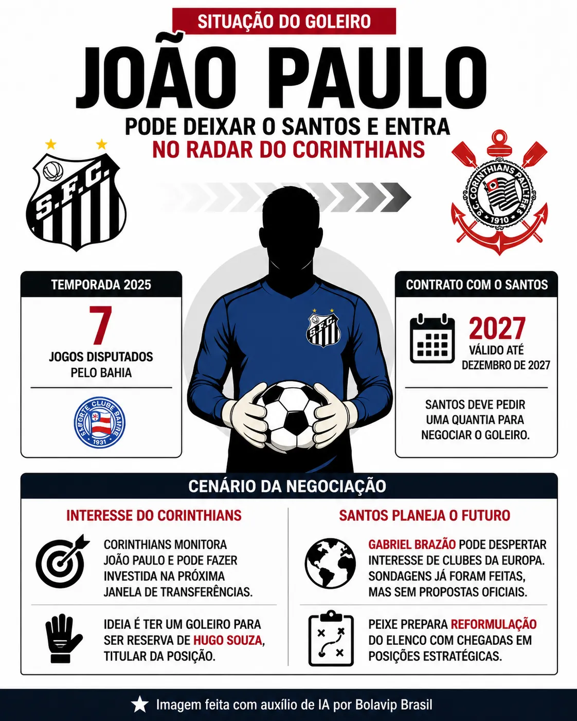 João Paulo foi um dos jogadores negociados pelo Santos durante a temporada de 2025. Com a crescente de Gabriel Brazão, o arqueiro viu uma boa oportunidade de trabalhar com Rogério Ceni no Bahia.