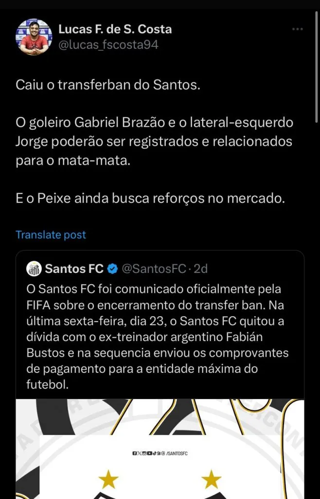 O jogador só será inscrito agora porque o Santos sofreu transfer ban, por conta da dívida com Fabián Bustos, mas como tudo se resolveu, agora, o Clube poderá publicar novos jogadores no BID e nas competições. Além de Jorge, um atacante também poderá ser novidade na lista de inscrições.