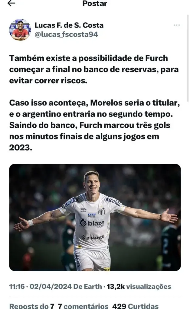 Na temporada até aqui, Furch soma oito jogos como titular em 15 disputados. Ele também marcou três gols em 2024, sendo um dos grandes responsáveis pelo ataque santista.