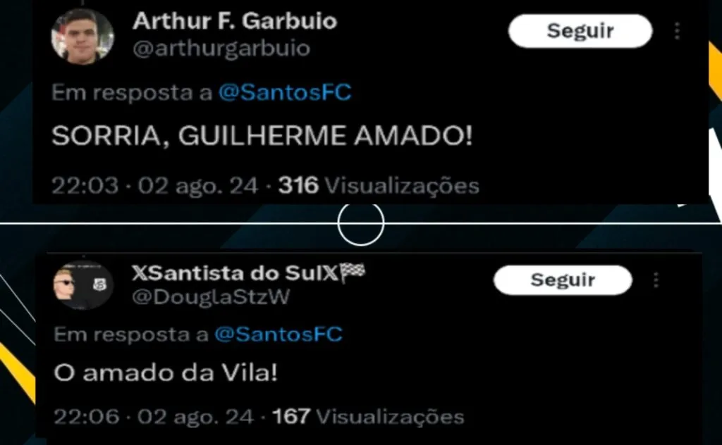 “EU SABIA! EU SABIA!LEI DO EX A NOSSO FAVOR! A NAÇÃO SANTISTA TE AMA GUILHERME AUGUSTO VIEIRA DOS SANTOS!”, comemorou um torcedor no Twitter/X.