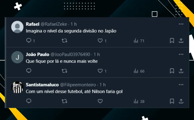 Dito isso, em vídeo de um de seus tentos divulgado pelo jornalista Fábio Sormani, os santistas resolveram se manifestar e pediram a permanência do atleta no futebol japonês. O Santos volta a campo amanhã, em Maceió, contra o CRB