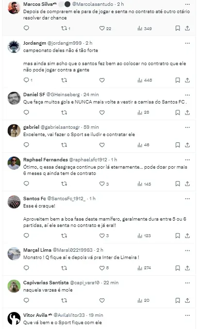 “Começa assim mesmo, faz um fumacêro, e depois senta no contrato”. “Que faça muitos gols e nunca mais volte a vestir a camisa do Santos”. “Depois de comprarem ele para de jogar e senta no contrato até outro otário resolver dar chance”, completaram torcedores.