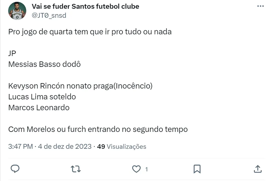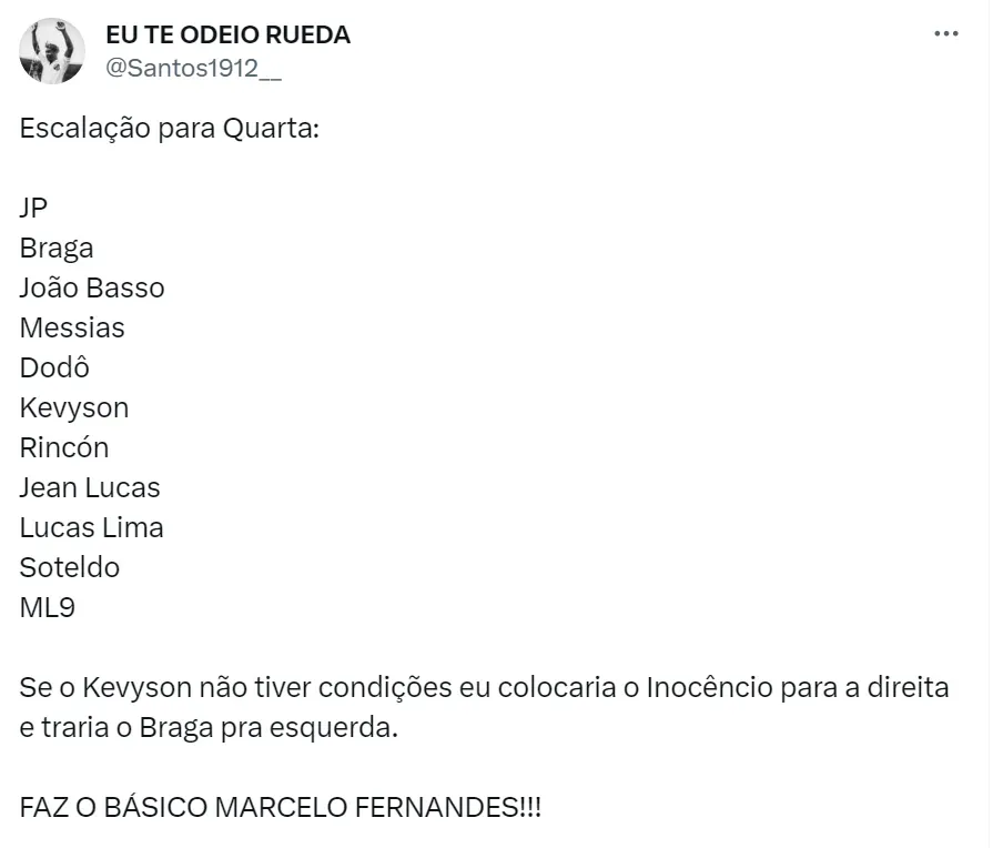 Além da utilização de Lucas Lima e Marcos Leonardo desde o começo do jogo, os torcedores do Santos pedem nas redes sociais para Marcelo Fernandes utilizar o time-base que venceu Bahia e Vasco, pelo segundo turno do Brasileirão.