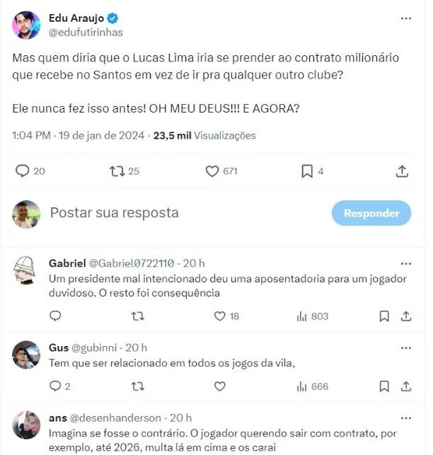 “Apuramos que Lucas Lima será oferecido ao Rosário Central da Argentina.. Pela manhã, o presidente do @SantosFC revelou que Lucas Lima já rejeitou quatro propostas (Vasco, Cruzeiro, Sport e Criciúma)”, escreveu o De olho no Peixe.