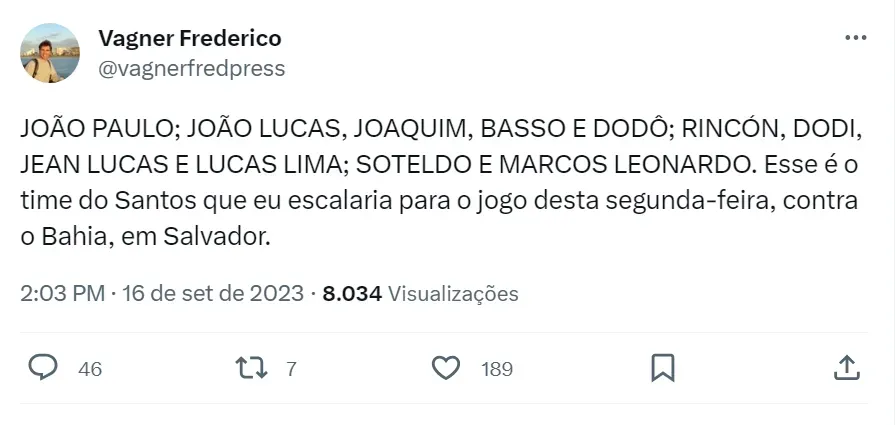 Na visão do jornalista Vagner Frederico, o Santos precisa de muitas mudanças no time titular para o duelo com o Bahia. Em relação ao jogo contra o Cruzeiro, o repórter faria seis mudanças, promovendo a volta de Lucas Lima a equipe. O camisa 23 iniciou no banco de reservas diante do Alviceleste e Aguirre foi muito criticado por isso.
