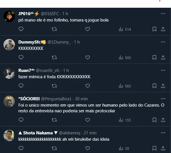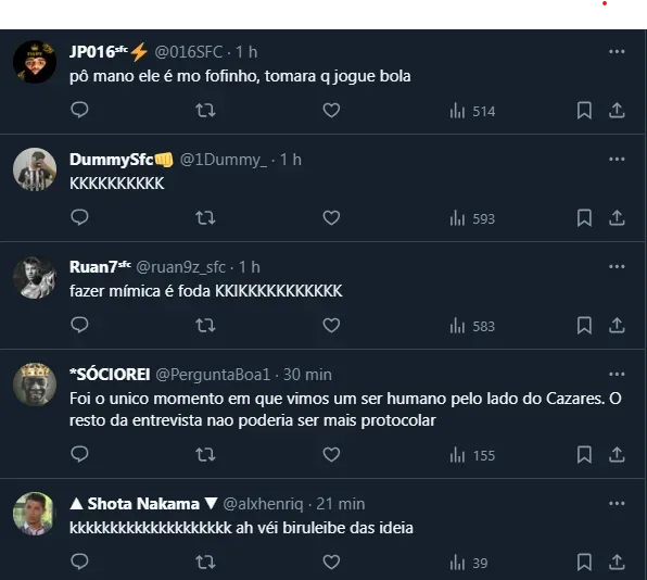 Ele prosseguiu: “Sabe o que tem que fazer dentro e fora de campo, se cuida mais, é profissional. Não tenho muito o que falar. O Cazares vem jogar bola e mais nada”, respondeu o meia equatoriano.