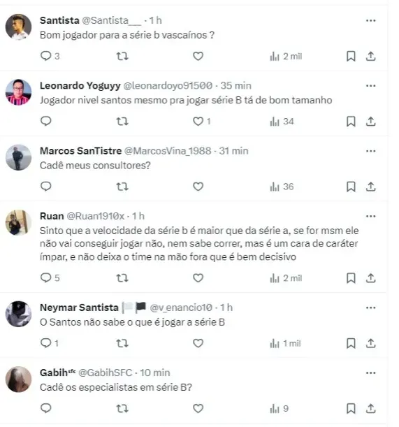 “Sinto que a velocidade da série B é maior que da série a, se for mesmo ele não vai conseguir jogar não, nem sabe correr, mas é um cara de caráter ímpar, e não deixa o time na mão fora que é bem decisivo“, disse outro torcedor reagindo negativamente.