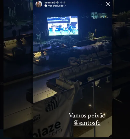 Quem estava assistindo a partida é o atacante Neymar. Afastado dos gramados por uma lesão, o ídolo do Santos postou um stories onde aparece o jogo sendo transmitido na TV, além de uma camisa do Peixe.