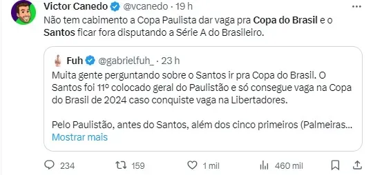 Como havia sido noticiado mais cedo, o Santos tem pequenas chances de disputar a Copa do Brasil em 2024. Financeiramente falando isso seria horrível para os planejamentos do Clube na próxima temporada.