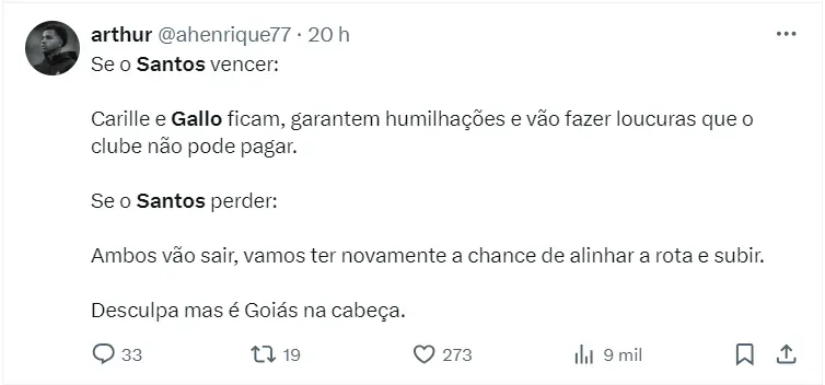 “Cobranças são normais devido aos últimos resultados negativos”, revelou Marcelo Teixeira quando questionado sobre o assunto. Vale destacar que esses que pedem a saída de Gallo e Marcelo Teixeira, tem paciência com Carille, que levou a equipe ao vice-campeonato paulista.