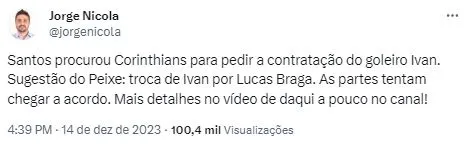 Contudo, o Santos propôs um molde de negócio para o clube do Parque São Jorge, disponibilizando um de seus atletas para um acordo. Trata-se de Lucas Braga. Nicola adianta que as conversas foram lançadas para equalizar um consenso entre as partes.