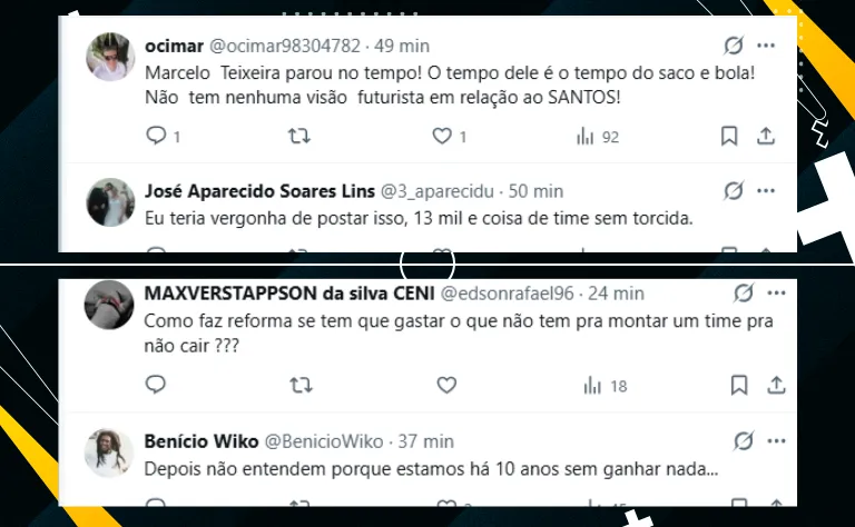 Não à toa, uma série de torcedores santistas criticaram a postagem de Marcelo Teixeira nas redes. Vale lembrar que a capacidade da Vila nem foi a principal questão, mas sim o fato dele publicar isso há uma semana da partida.