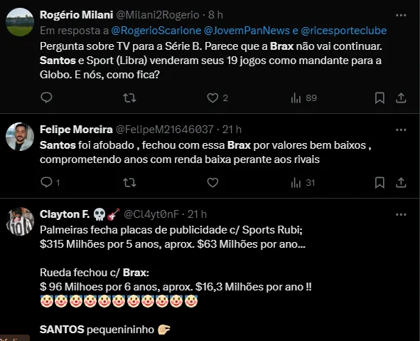 “Quero atualizar sobre os números do Peixe. O Santos fechou um acordo com a Brax, mesma empresa que acertou com outros clubes brasileiros. O acordo do Santos prevê um pagamento de R$ 98 milhões por cinco temporadas, de 2025 a 2019, ou seja, R$ 19,6 milhões por ano“, disse o jornalista.