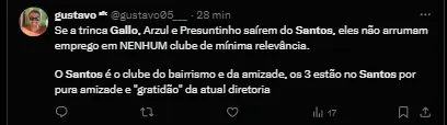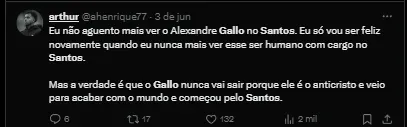Gallo vem tendo seu trabalho questionado por torcedores santistas e internamente também já há cobranças. Algumas contratações nas últimas janelas de transferências pesaram para isso.