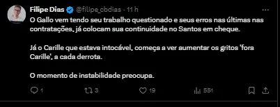 Segundo o jornalista Filipe Dias, do portal Versus, através de publicação nas suas sociais, o dirigente na balança no cargo e pode ser um dos primeiros a deixar a equipe.