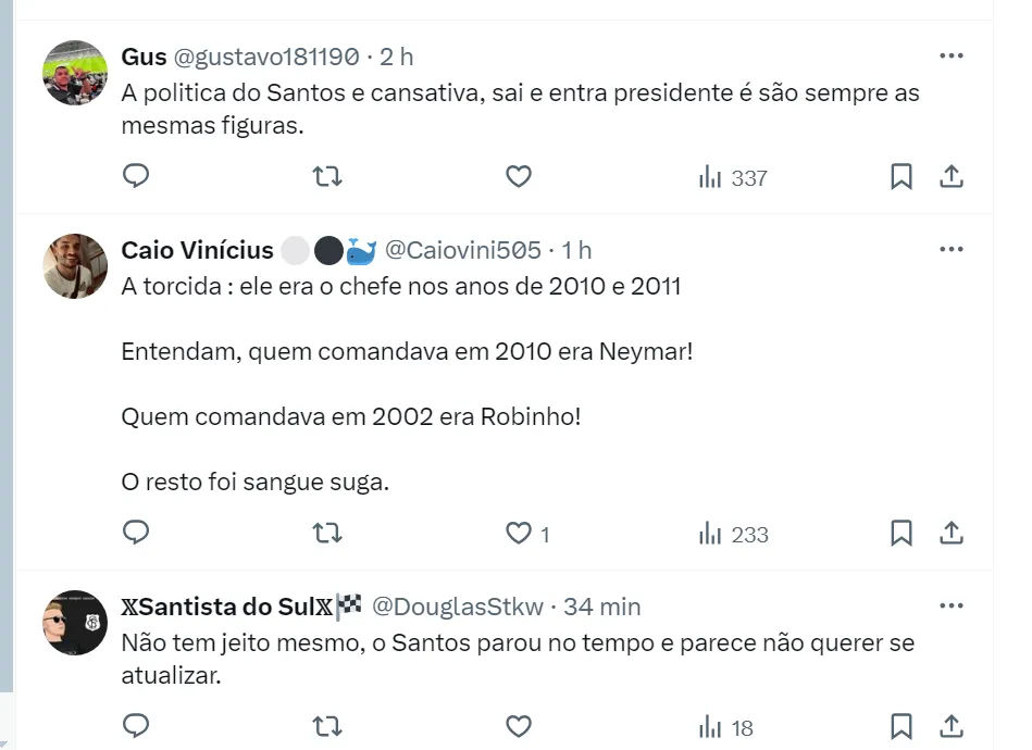 É especulado que o presidente santista pode colocar FS no comando do futebol e seria o novo ‘chefe’ de Alexandre Gallo. O ex-jogador, contratado ainda na gestão de Andrés Rueda, não seria demitido, mas perderia poder nas decisões do clube.