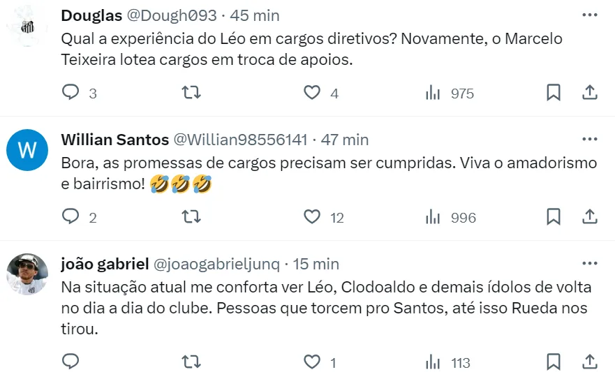 Segundo o canal que cobre o dia a dia do Santos, Léo vai ter o cargo de assessor de futebol do presidente e Fernando Silva também deve integrar departamento de futebol do Peixe (ainda sem função revelada).