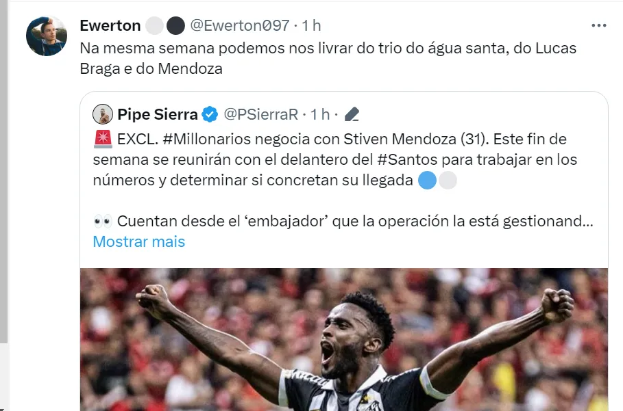 Mendoza tem um dos maiores salários do elenco do Santos e contrato até o fim de 2025. O Peixe não vai dificultar a saída do jogador, que não tem mais clima com a torcida para permanecer na Vila Belmiro.