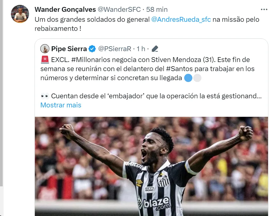 Outro jogador estrangeiro que pode selar a saída do Santos nos próximos dias é o atacante Stiven Mendoza, que terminou o ano em baixa e sendo um dos mais criticados pela rebaixamento do Clube Paulista.