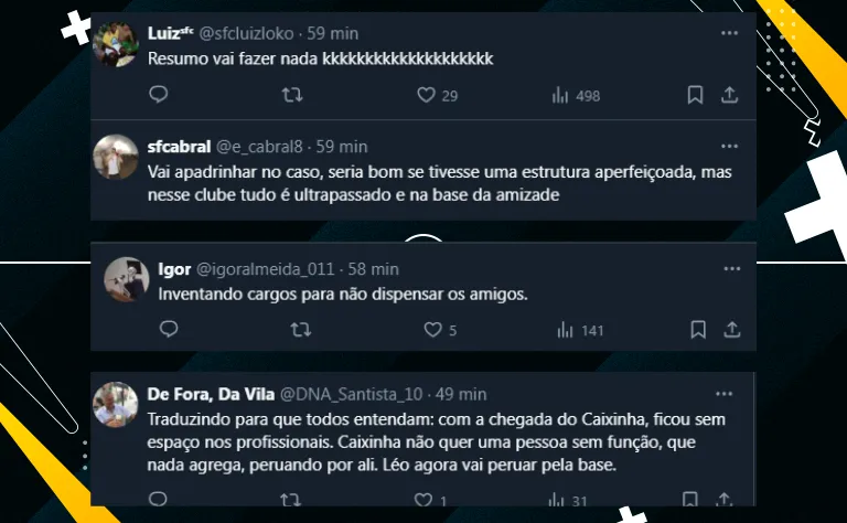 Por fim, voltando à Série A após um ano de ausência, o Santos quer voltar a conquistar um troféu depois de nove anos. A última taça foi em 2016, no Paulistão conquistado diante do Audax de Fernando Diniz. Veja a repercussão da torcida sobre Léo: