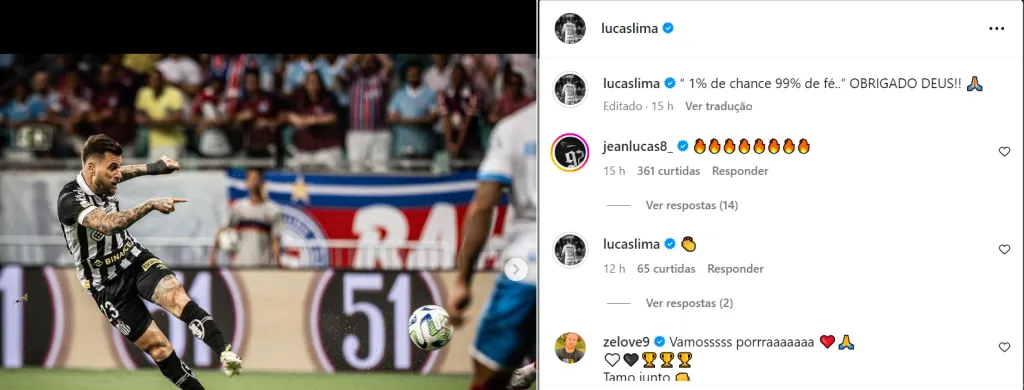 O discurso de Marcos Leonardo ao fim da partida de ontem inflamou a torcida do Peixe nas redes sociais e ganhou coro de outros jogadores do elenco, como o meia Lucas Lima. Em seu Instagram, o camisa 23 do Clube da Vila Belmiro postou: “1% de chance 99% de fé..” OBRIGADO DEUS!! 🙏🏼”. Após muita gente ter dado o Santos como ‘morto’ no Brasileirão, o elenco Alvinegro promete lutar até o fim para fugir do Z-4.