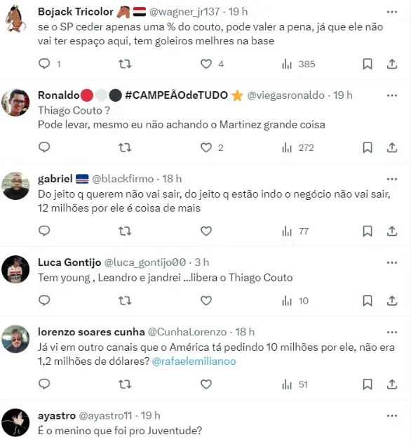 A atualização do mesmo portal, mas nesta semana, traz que o América-MG pediu ao São Paulo para incluir o goleiro na negociação por Martínez, ou seja, pode acabar melando os planos do Peixe.