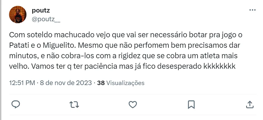 Patati, por sua vez, foi destaque na Copinha de 2022 e tem nove jogos nesta temporada. Marcelo Fernandes pode apostar na experiência ou na juventude para substituir Soteldo contra o Goiás.
