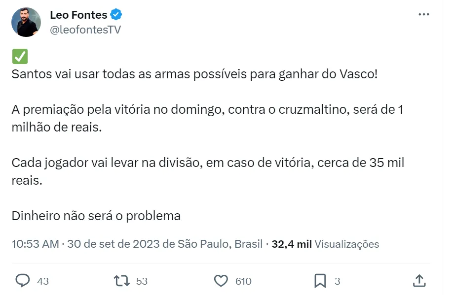 Depois, o time santista fez um treino aberto neste sábado (30), na Vila Belmiro, para o time sentir o calor da torcida. E, por último, o presidente Andrés Rueda está prometendo o famoso ‘bicho’ ao elenco do Peixe na quantia de R$ 1 milhão em caso de vitória contra o Vasco, como informou o jornalista Leo Fontes em seu Twitter. Cada jogador receberia R$ 35 mil pelos três pontos diante dos cariocas.