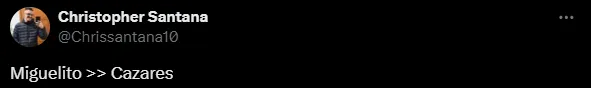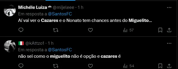 “Não sei como o Miguelito não é opção e Cazares é”, “Aí vai ver o Cazares e o Nonato tem chances antes do Miguelito…”, “Miguelito perdendo espaço para o Cazares kkkkkkk” e “Miguelito >> Cazares”, foram alguns comentários.