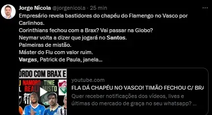 O medalhão sul-americano teve seu nome ventilado na Vila Belmiro para 2024. No entanto, uma atualização trazida por Jorge Nicola revela que a contratação está ficando mais distante por causa de dois motivos.