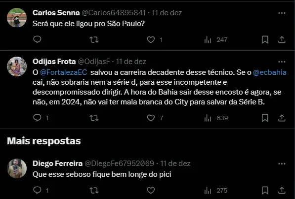 “Após a vitória do Fortaleza, o Bahia ficou na Série A, então o Rogério, muito educadamente ligou agradecendo pela vitória, dizendo que esperava esse tipo de postura da gente que faz aqui o Fortaleza“, disse o presidente.