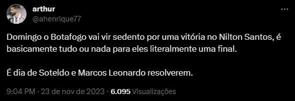 Agora, o Fogão encara o Santos, no domingo (26), às 16h, no Engenhão, precisando da vitória para seguir sonhando com o título do Brasileirão. O Peixe contará com Soteldo, que deu a sua opinião sobre o Botafogo.