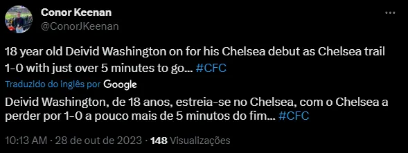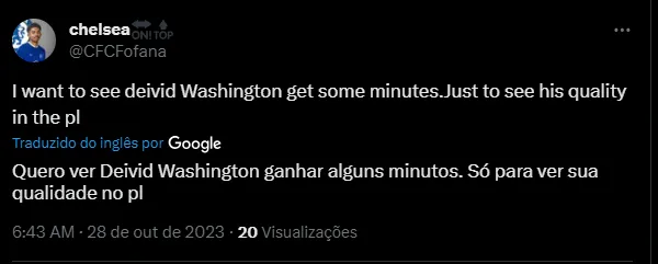 “A entrada de Deivid Washington, ele pode ser a grande história, os torcedores do Chelsea irão rapidamente apreciar”, “Quero ver Deivid Washington ganhar alguns minutos. Só para ver sua qualidade na PL” e “Deivid Washington, de 18 anos, estreia no Chelsea, com o Chelsea a perder por 1-0 a pouco mais de 5 minutos do fim…”, disseram os torcedores.
