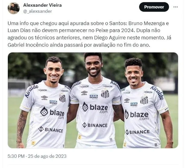 De acordo com apurações do Bolavip Brasil, o Santos não vai ficar com os jogadores Bruno Mezenga e Luan Dias, ambos emprestados pelo Água Santa, destaque do Campeonato Paulista deste ano, para a próxima temporada. Já existe um entendimento de que os dois jogadores não agregam tecnicamente.