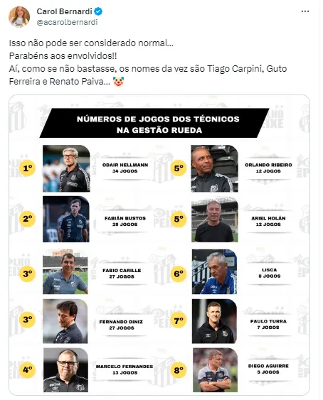 A profissional acabou trazendo o números de jogos que os treinadores da gestão Rueda ficaram no cargo e contestou isso. Segundo ela, Tiago Carpini, Guto Ferreira e Renato Paiva vêm sendo comentados: “Isso não pode ser considerado normal… Parabéns aos envolvidos!! Aí, como se não bastasse, os nomes da vez são Tiago Carpini, Guto Ferreira e Renato Paiva”, disse.