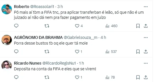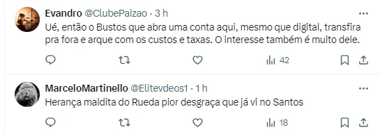 Muitos torcedores estão revoltados com a situação. O argumento é que a resolução é do interesse de Bustos e que ele teria que abrir uma conta no Brasil e não o Santos pagar a mais por isso.