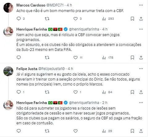 “Ele estava com uma expectativa grande para a seleção principal, ele está fazendo por onde, demonstrando seu valor. Ele ficou com muita ansiedade a respeito disso. Não queremos privar ele de jogar pela seleção olímpica”, esclareceu Marcelo Fernandes.