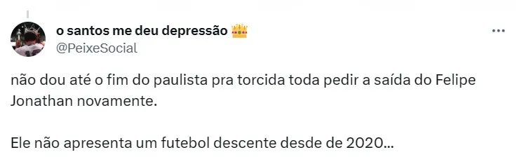 “Não existe mais negociação com o Fortaleza. Ele vai seguir”, resumiu o dirigente. Com contrato até fevereiro de 2025 com o Santos, Felipe Jonatan não atua desde abril e não chegou a fazer parte da campanha santista no Brasileirão.
