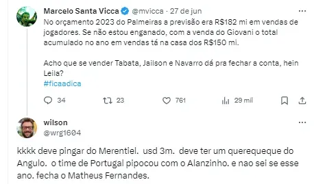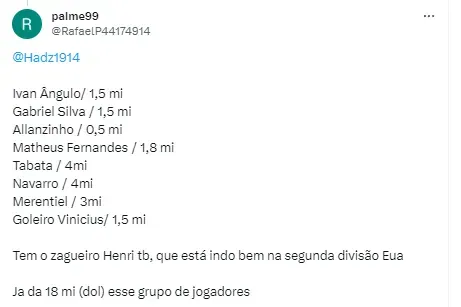 Já Merentiel, segundo o Diário Olé, ficará no Boca Juniors, deve ser adquirido por algo na casa dos R$ 15 milhões. Conforme o site Goal, Matheus Fernandes deverá ser comprado pelo Red Bull Bragantino por algo na casa dos R$ 9,5 milhões.