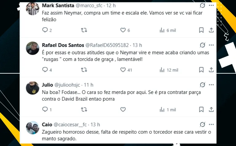 Por último, a atitude de Neymar em revelar injustiça na saída de João Basso fez com que a torcida santista criticasse o craque. Confira alguns comentários a respeito do tema: