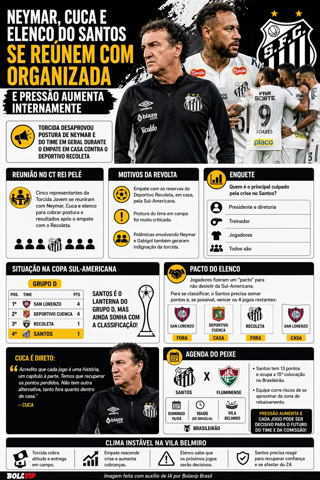 Nesta quinta-feira (16), o Santos recebeu no CT Rei Pelé cinco representantes da Torcida Jovem, que se reuniram com Neymar, Cuca e o restante do elenco para debater sobre o momento de crise após o empate contra os reservas do Deportivo Recoleta, do Paraguai. As informações são do ge.