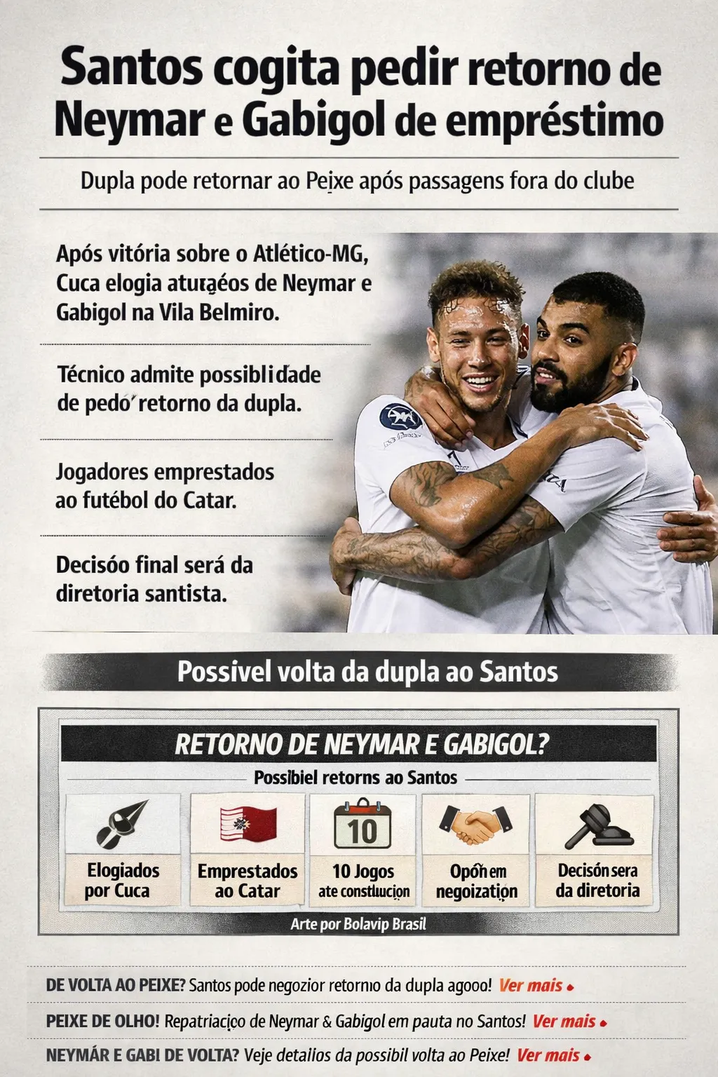 O técnico Cuca destacou a atuação de Neymar e Gabigol após a vitória do Santos por 1 a 0 sobre o Atlético-MG, na Vila Belmiro, pela 11ª rodada do Brasileirão. A dupla voltou a atuar após desfalcar o time na Sul-Americana e foi determinante para o desempenho mais competitivo da equipe.
